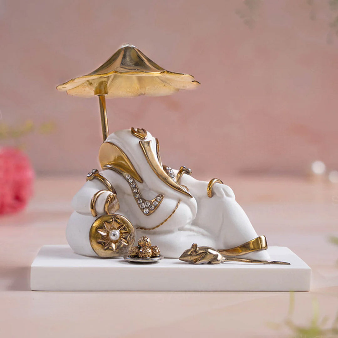Resting Ganesh Idol With Umbrella For Car Dashboard -Gold Plated (4 Inch)