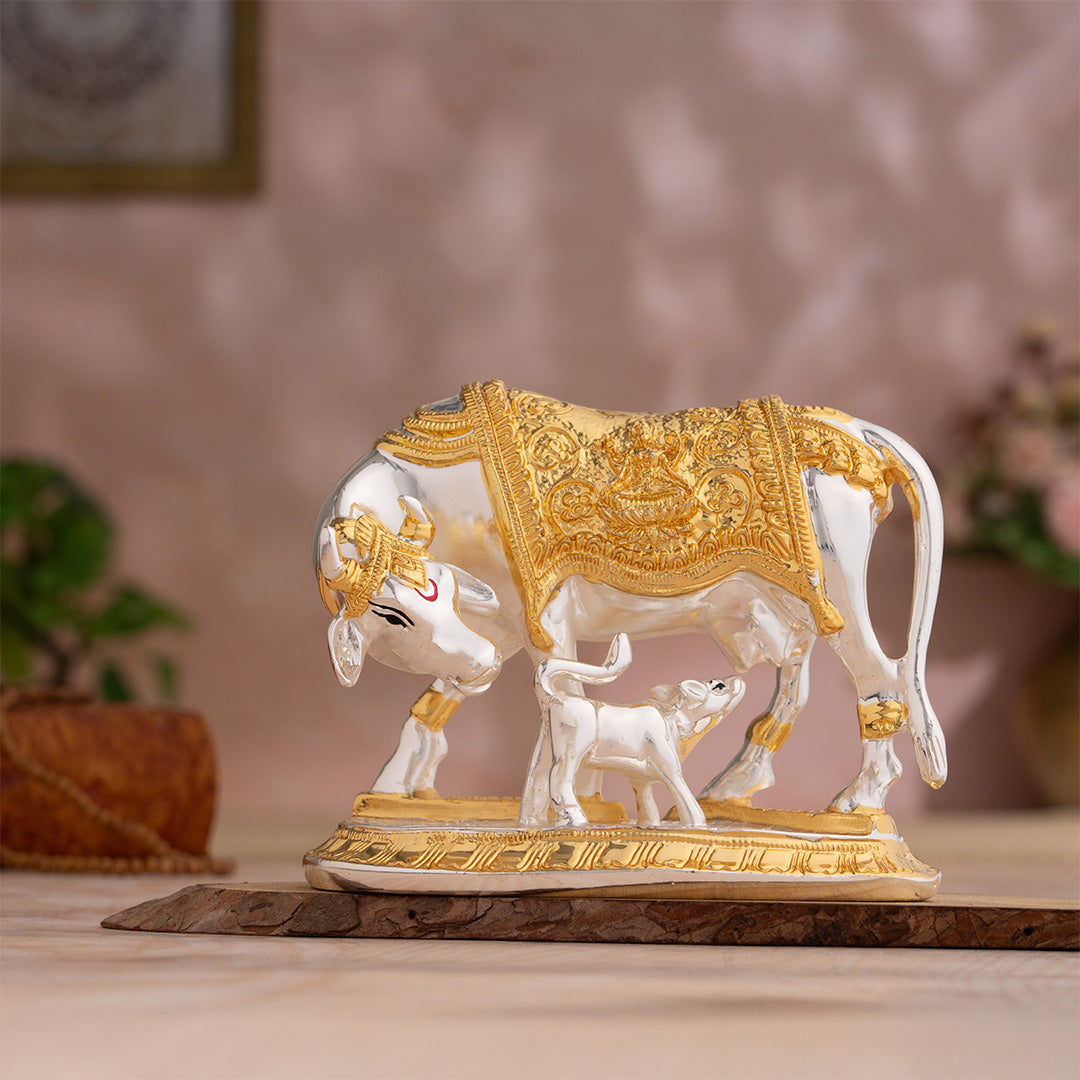 Kamdhenu Cow with Calf Idol - Gold & Silver Plated (5 Inch)