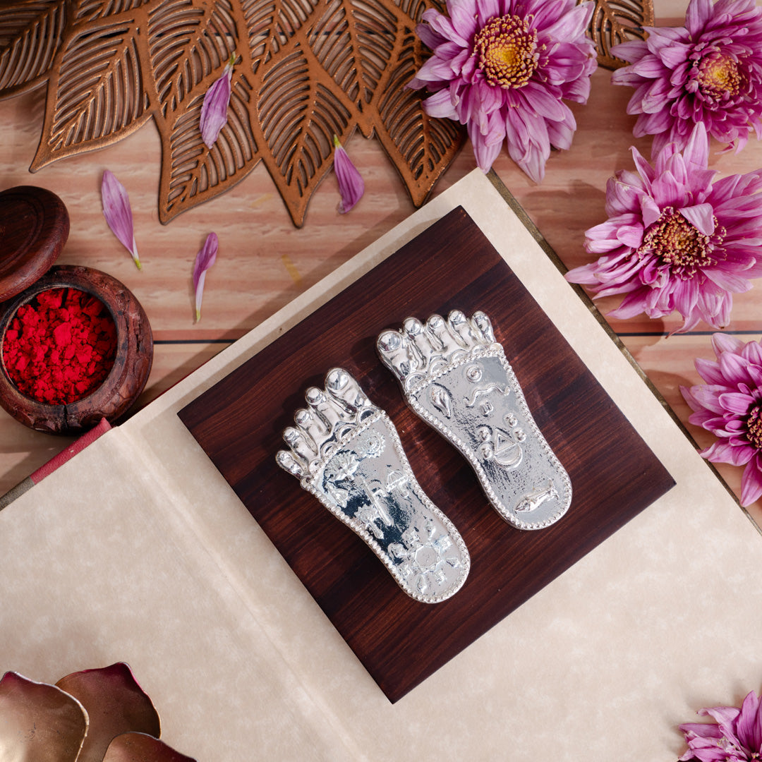 Shree Krishna's Charan Paduka (Lotus Feet) On Base - Silver Plated