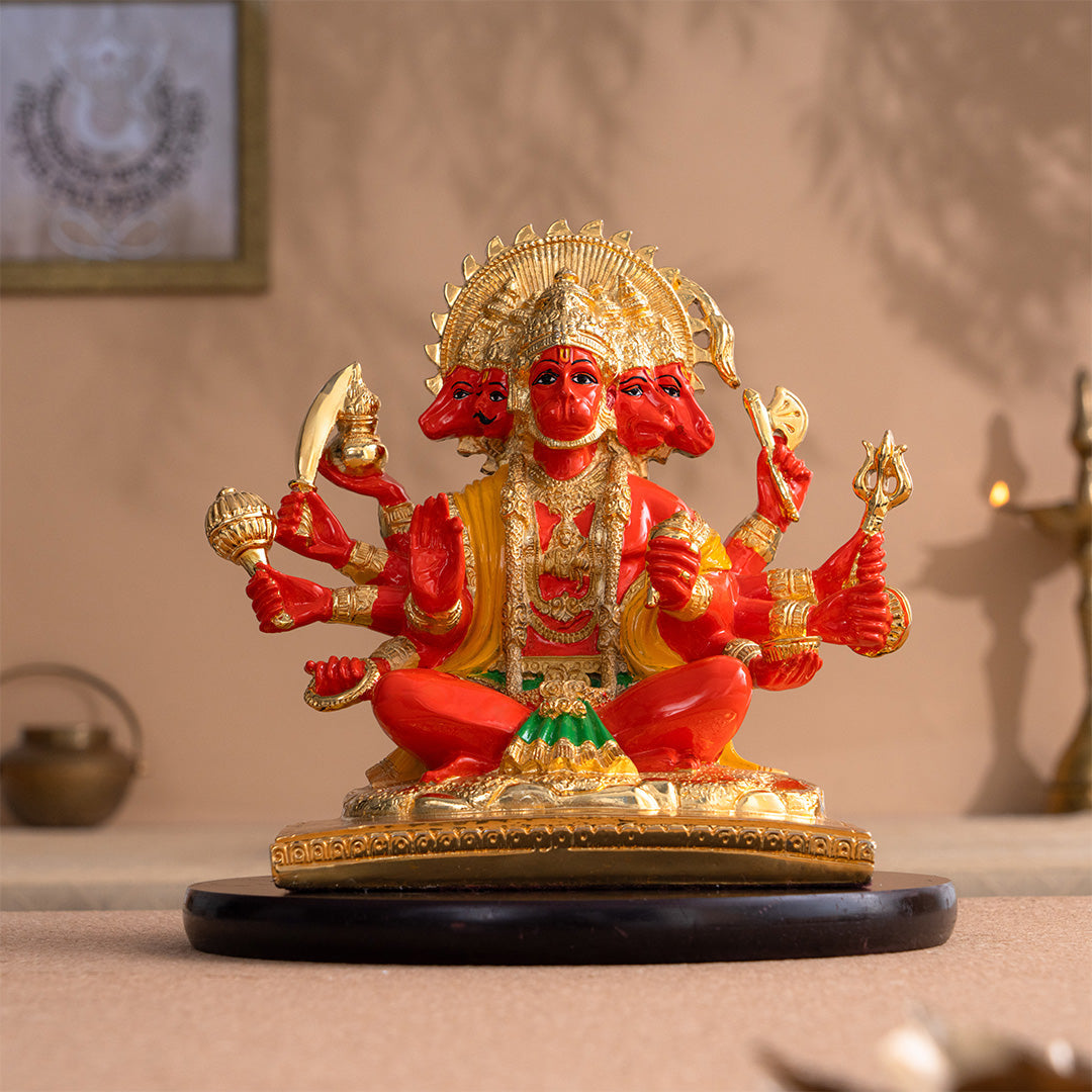 Panchmukhi Hanuman Statue With Orange Enamel - Gold Plated (8 Inch)
