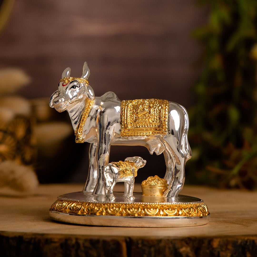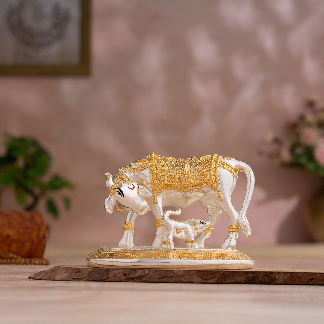 Auspicious Kamdhenu Cow with Calf Idol - Gold and Silver Plated (4 Inch)