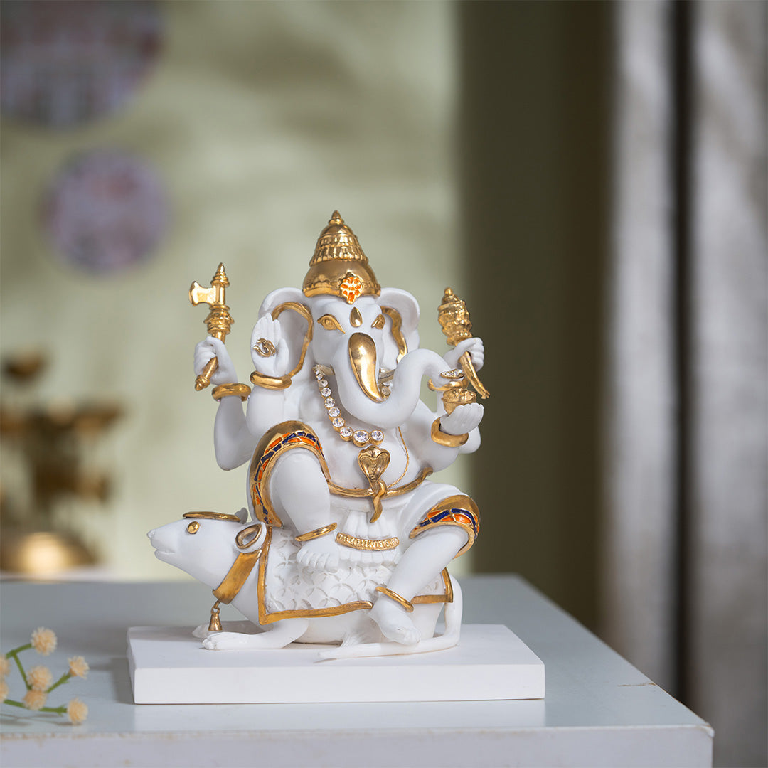 Elegant White & Gold Lord Ganesha With Mushak (6.5 Inch)