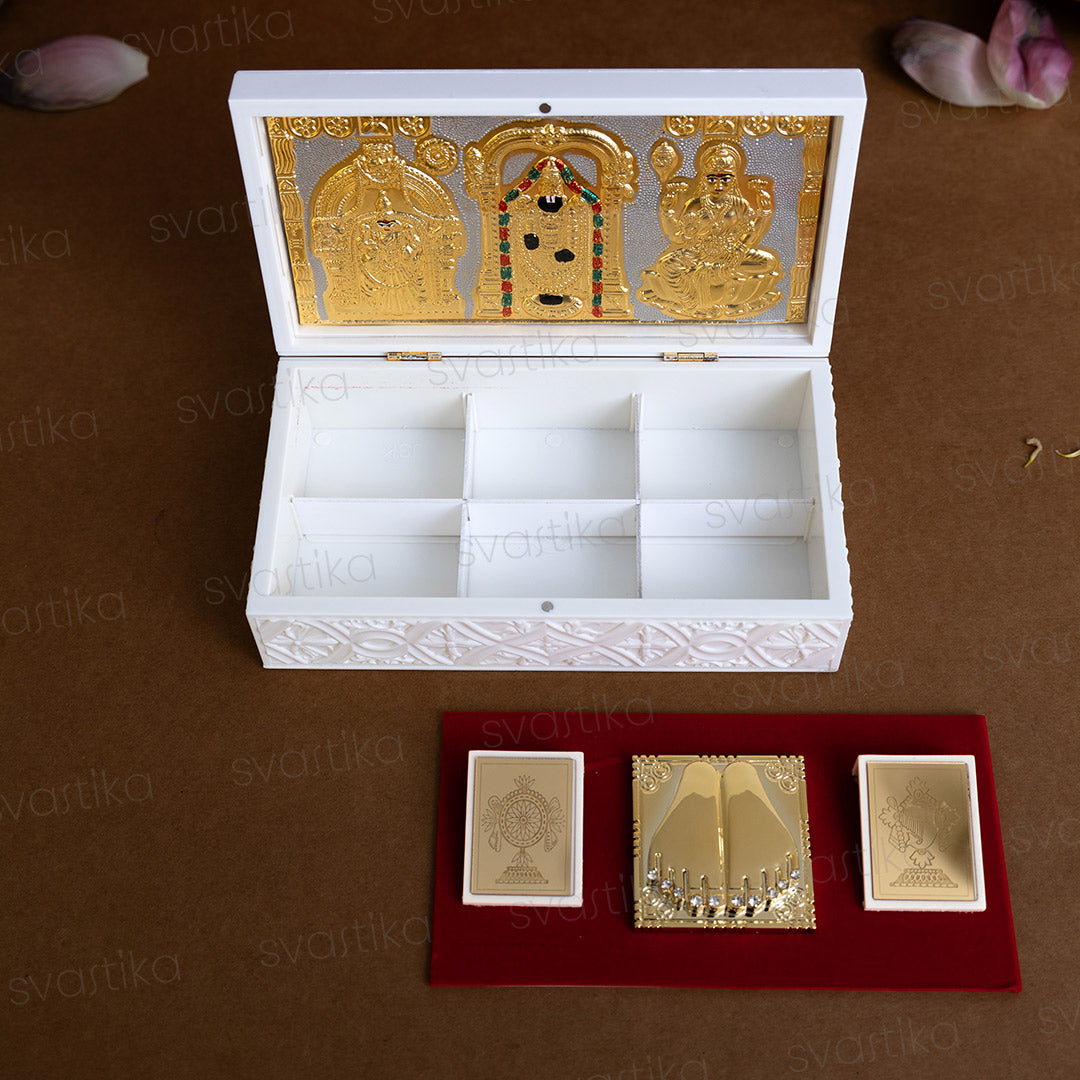 This pooja box is designed to inspire devotion and elevate your spiritual practices. The centerpiece, featuring the sacred feet of Lord Balaji, is complemented by intricately detailed images and symbols that echo his divine energy. Each element is accentuated with a radiant layer of 24 Karat Gold foil, making it a striking addition to any space.
