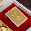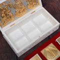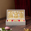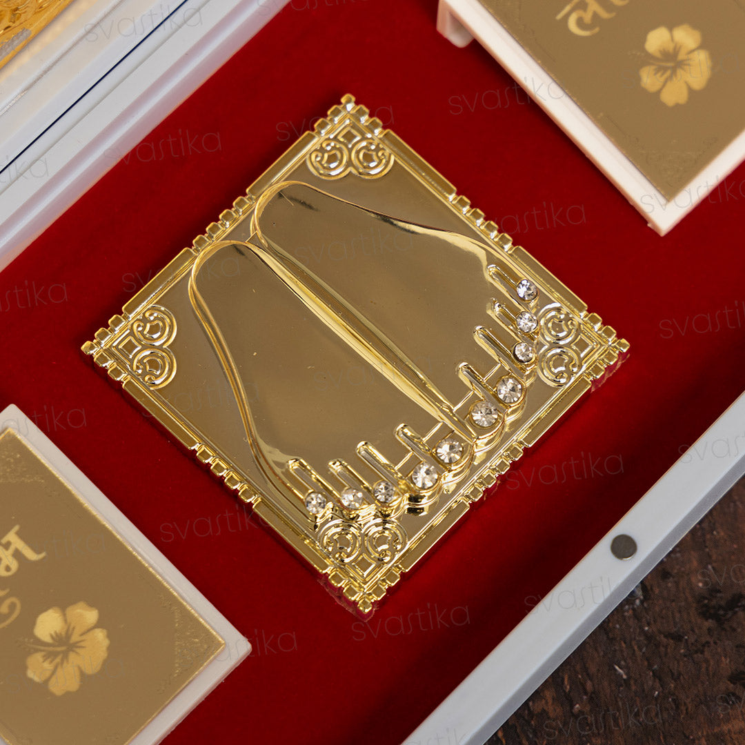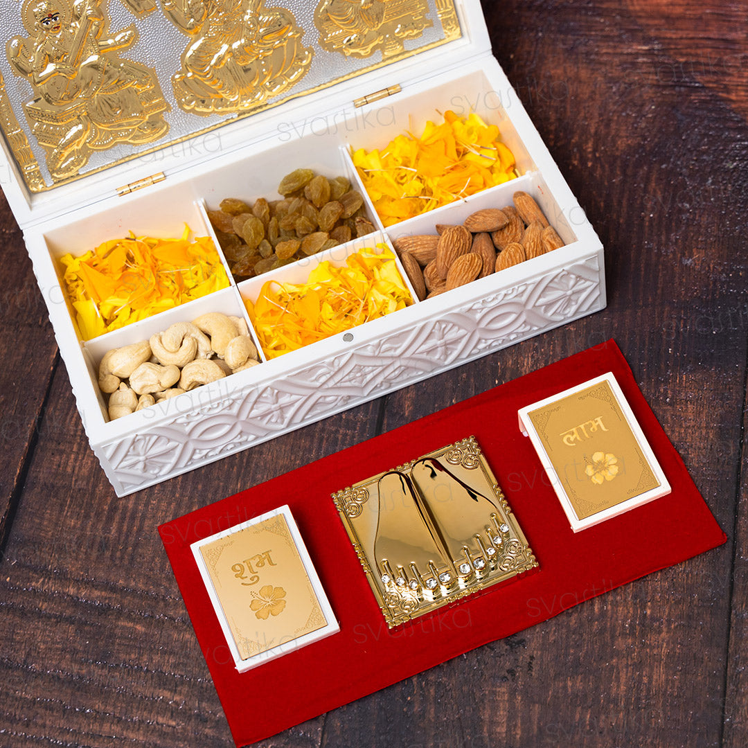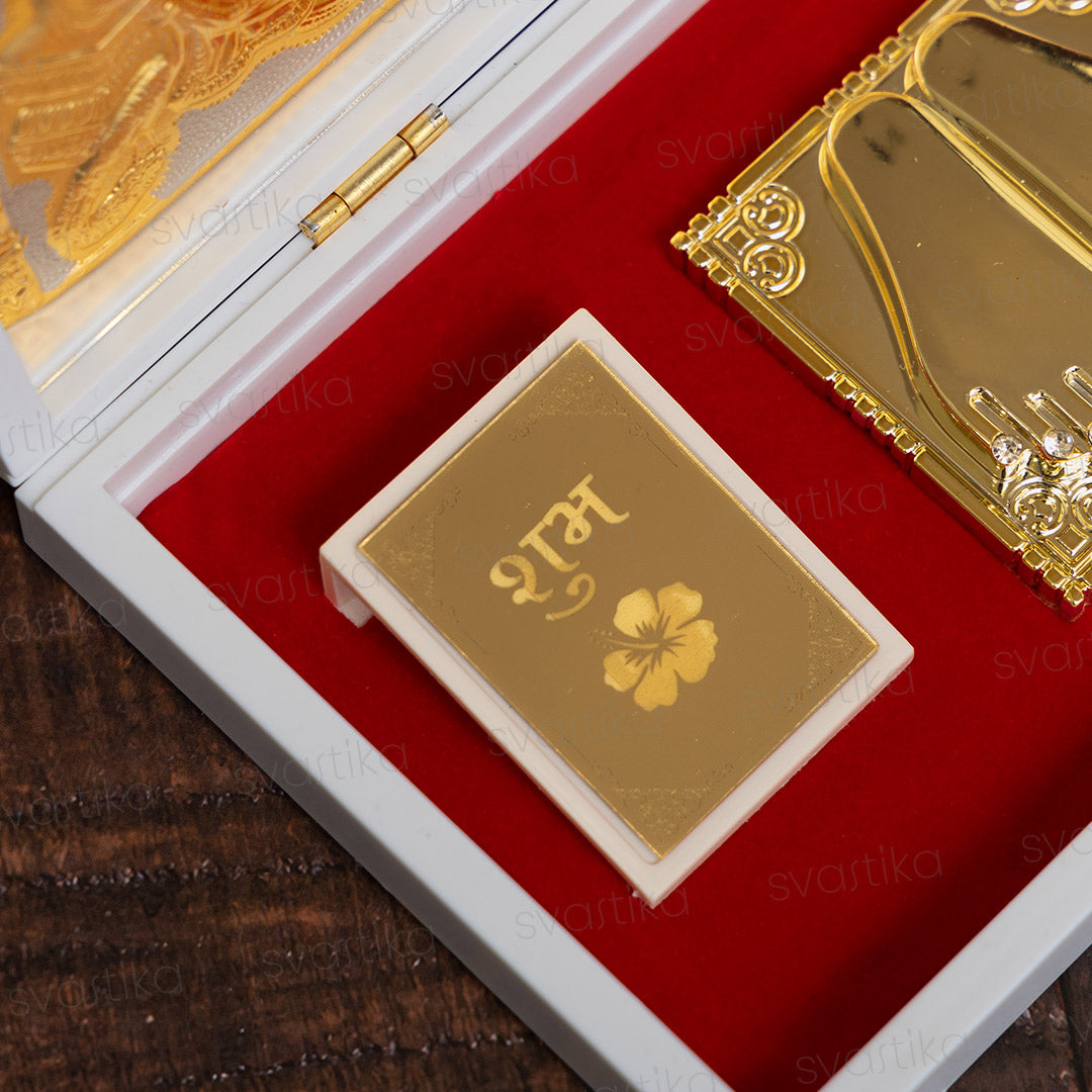 The top half of the box features intricate gold-plated engravings of the revered deities Saraswati (goddess of knowledge), Lakshmi (goddess of wealth), and Ganesha (remover of obstacles), symbolizing wisdom, prosperity, and protection. Adding to its spiritual essence, the temple includes a gold plated "Shubh Labh" message to safeguard your space from negativity.