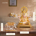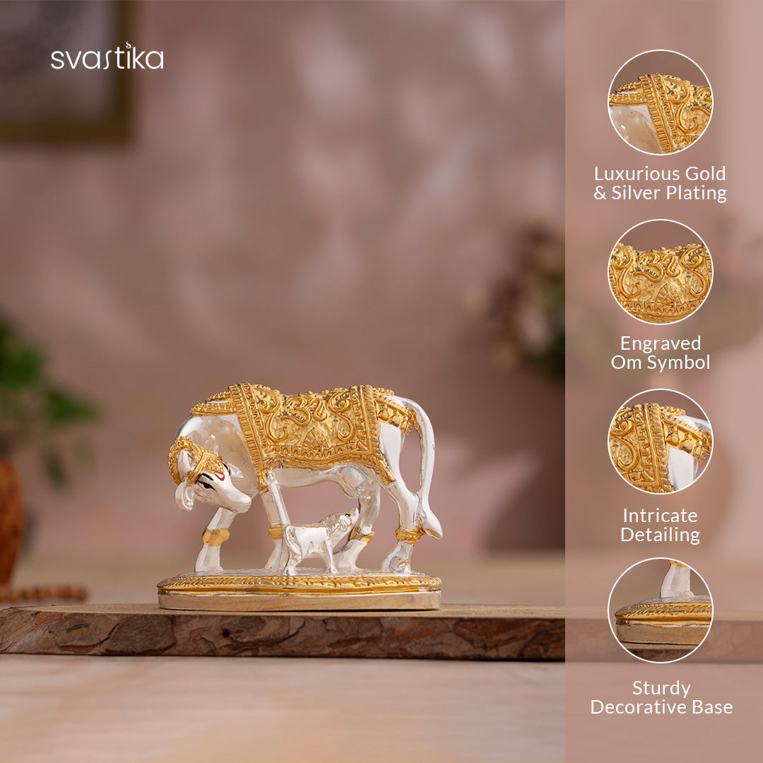 The Kamdhenu Cow with Calf, elegantly finished in gold and silver plating, is revered in Hindu tradition as the mother of all cows and a symbol of nurturing energy, wealth, and wish-fulfillment. It is a Vastu-positive idol that enhances spiritual and material growth.