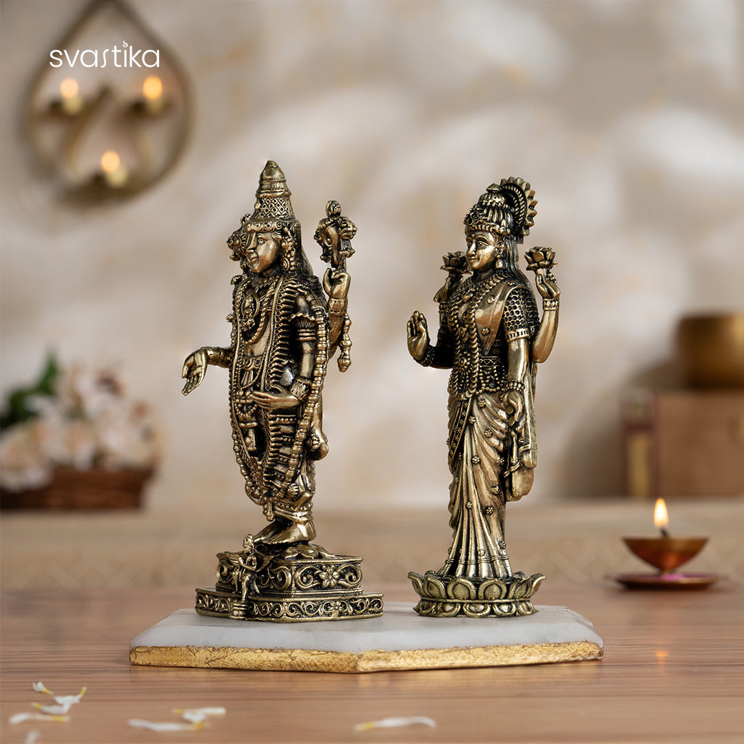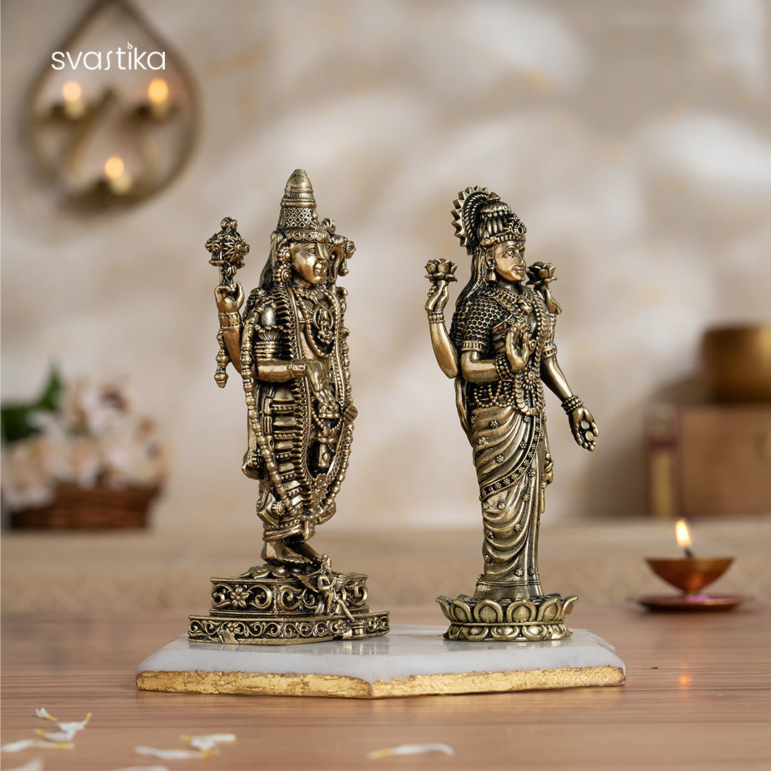 Meticulously cast, this divine duo depicts Lord Venkateswara Swamy and Goddess Lakshmi standing tall on ornate brass bases.