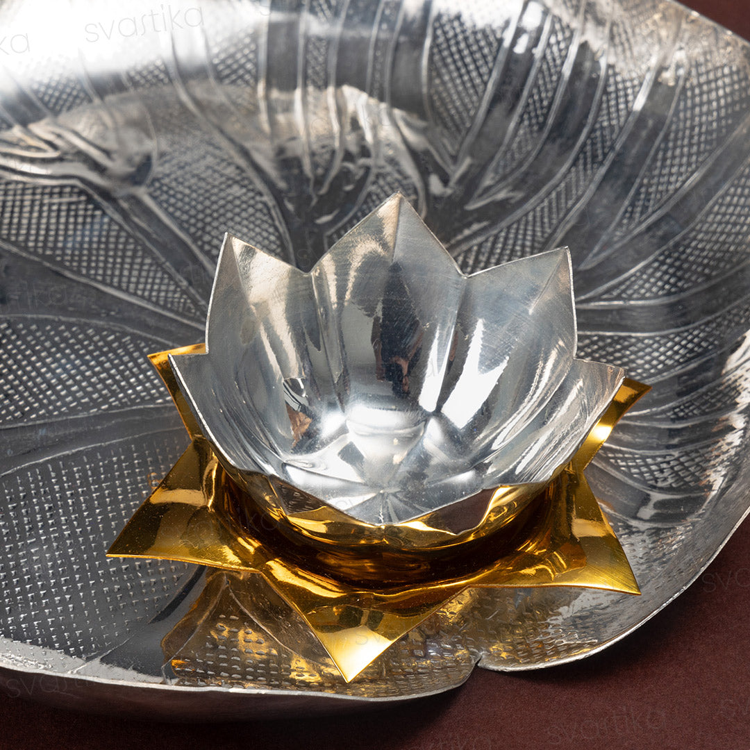 - Silver Plated Lotus Leaf Thali: The stunning centerpiece with intricate lotus leaf design symbolizing purity and spiritual growth.