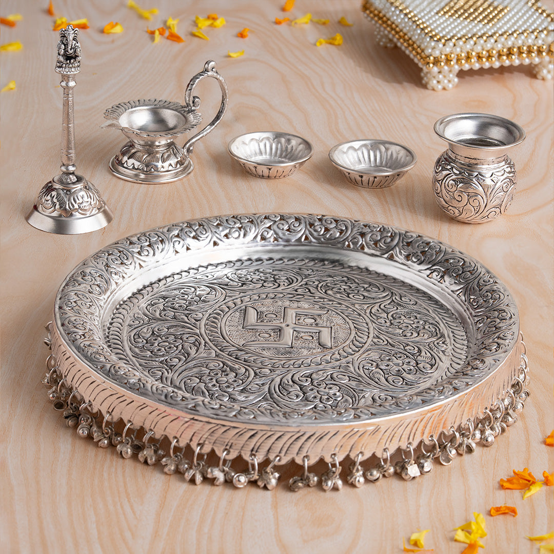 - Swastik Engraved Silver Pooja Thali: The stunning centerpiece adorned with traditional Svastika prosperity symbols in elegant silver plating.